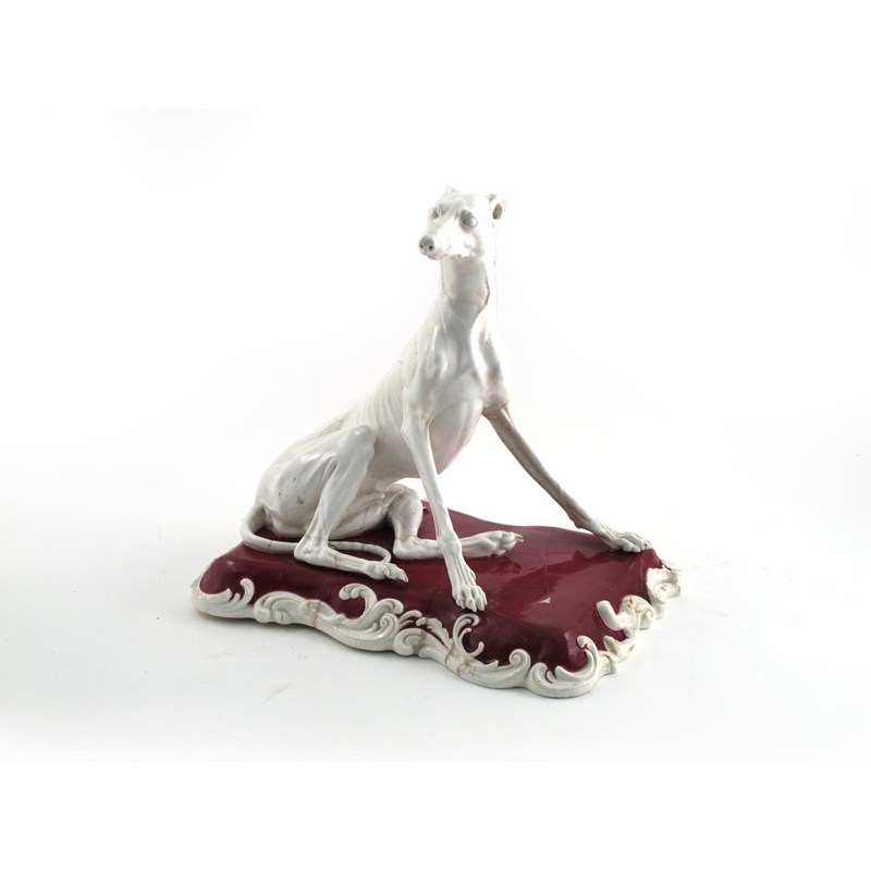 A massive and rare English porcelain model of an Italian greyhound 1st half 19th century, perhaps Rockingham, finely modelled and seated with head turned, raised on a claret cushion with white scrolling edges, damages, 40cm across.