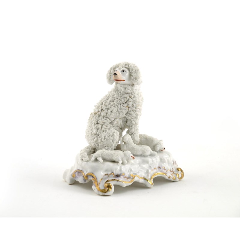 A Staffordshire porcelain model of a poodle and puppies c.1820-30, the mother seated on her haunches with head turned, her three puppies playing or sleeping by her feet, raised on a scrolling base highlighted with gilding, 12.5cm high.