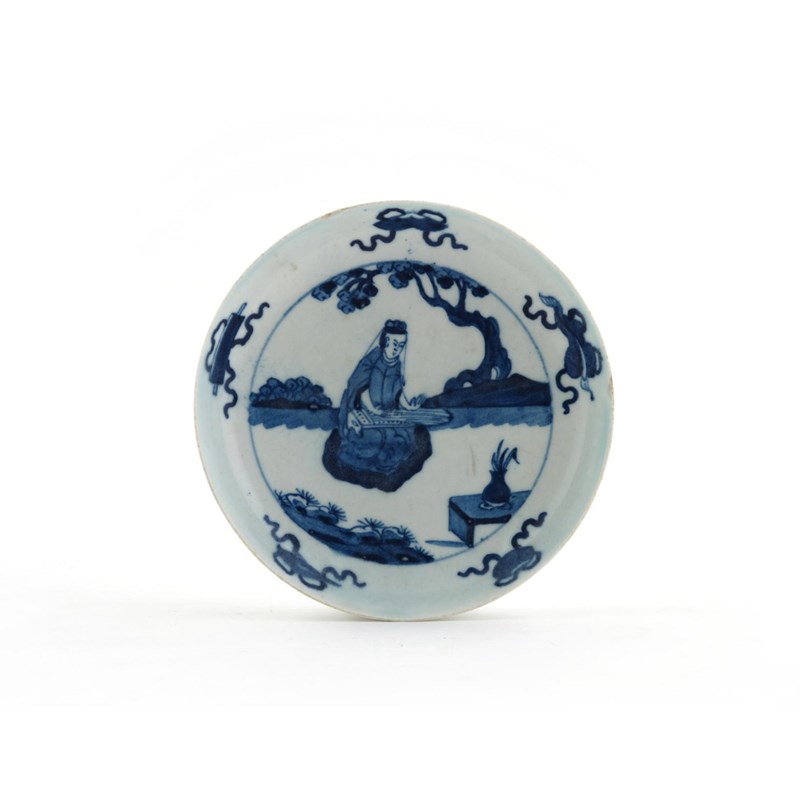 An early Bow blue and white saucer c.1754-56, painted with the Koto Player, an Oriental lady seated in a garden landscape and playing an instrument resting on her lap, the rim decorated with auspicious objects, 11.3cm.