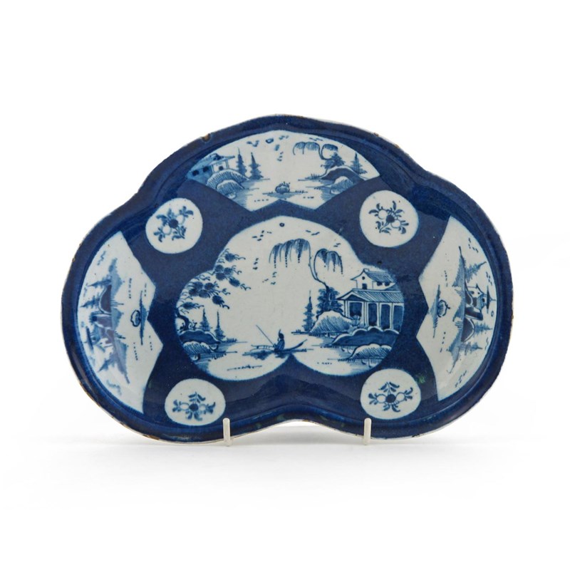 A Bow blue and white kidney-shaped dish c.1760, the central panel painted with a figure fishing from a boat, reserved on a powder blue ground within further circular and fan-shaped panels, the underside of the rim with tied scrolls and other objects, pseudo Chinese mark to the base, small glaze chips to the rim, 26cm.