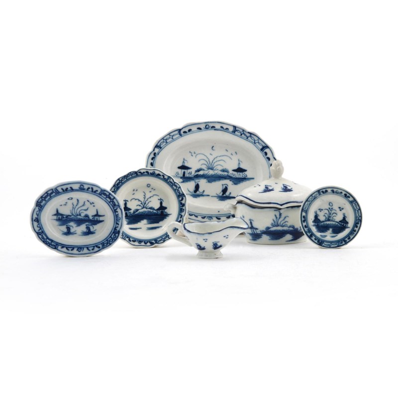 A Caughley combined miniature dinner service c.1770-80, painted in blue with the Island pattern. Comprising: a tureen and cover, two serving dishes, a sauceboat, and two plates of different size, 10.4cm max. (7)