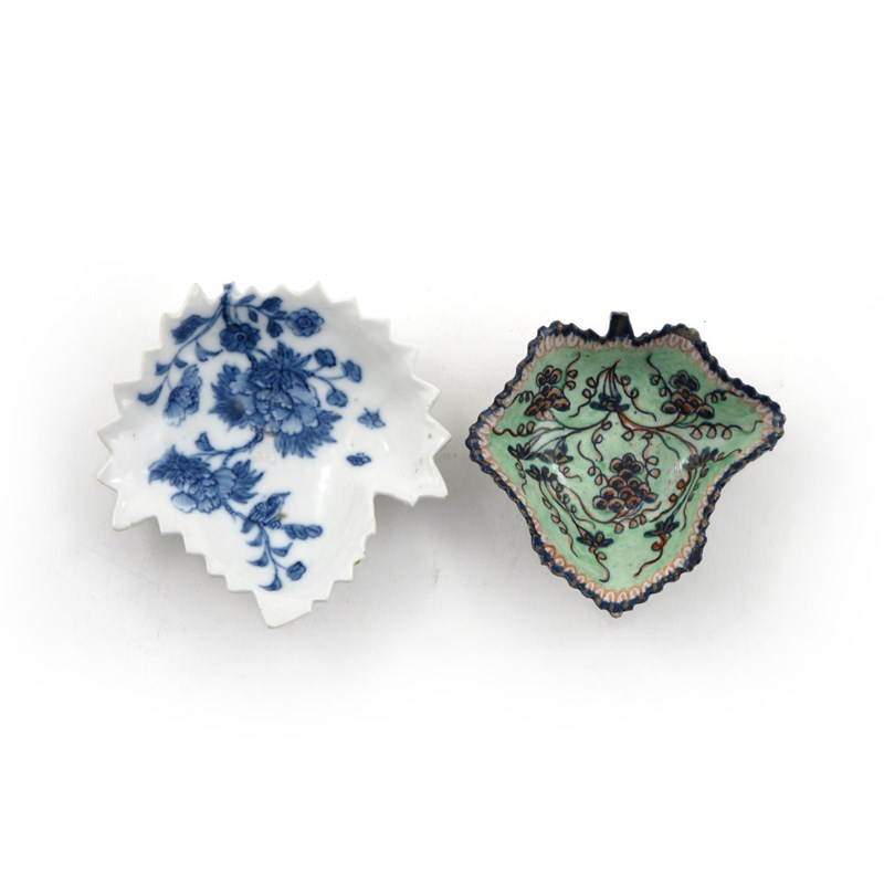 A Chinese soft-paste porcelain pickle dish 18th century, formed as a leaf and painted in blue with flying insects and a small bird on flowering branches, and an English porcelain pickle dish originally decorated with blue grapevine and later enamelled with green and red, tiny rim chips, 9.2cm max. (2)