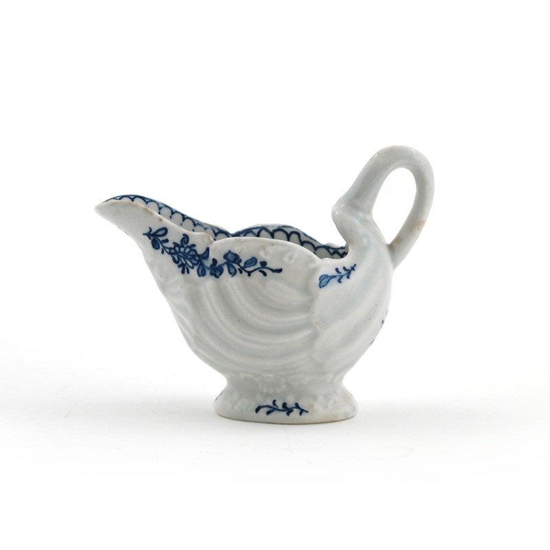 A Lowestoft blue and white creamer c.1770, of dolphin shape, the shell-moulded exterior painted with blue floral sprays, the interior rim with a jagged border, 9.5cm.