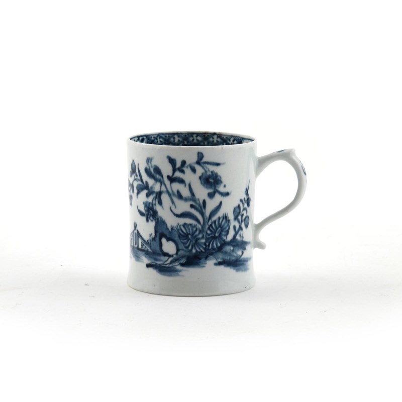 A Lowestoft blue and white mug c.1765, painted with a bird perched on a flowering branch above holey rockwork and a fence, the inside rim with a hatched band, the foot slightly flared, 8.4cm high.