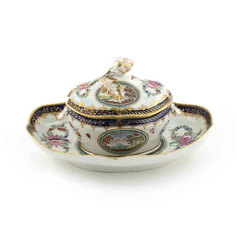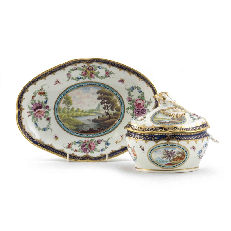 A Worcester sauce tureen with cover and stand c.1780-85, painted in the Dalhousie manner with oval panels of river scenes, lakeside views and ruins in landscapes, within floral garland arrangements and with scattered moths and other insects, the rims with blue and gilt borders, open crescent marks, 24cm. (3)
