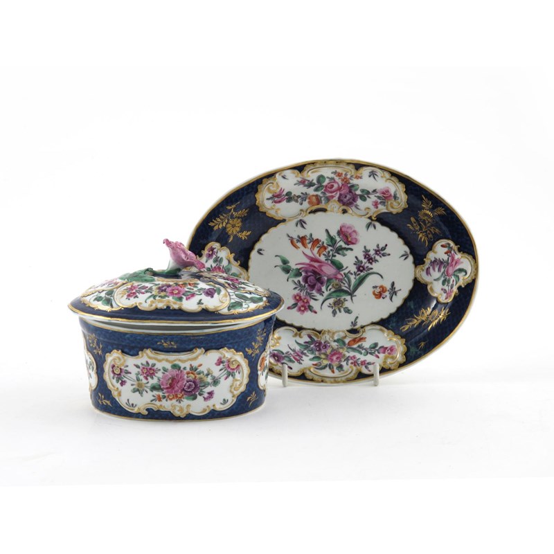 A Worcester potted meat tub with cover and stand c.1770, painted with bright panels of flowers within moulded scrolling cartouches, on a blue scale ground, square seal marks, 19.6cm. (3)