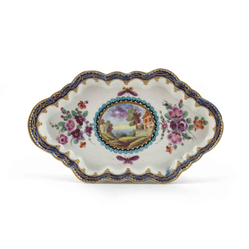 A Worcester spoon tray c.1780, decorated in the Dalhousie manner with a central landscape panel within floral arrangements and flying moths, the rim with a blue and gilt border, open crescent mark, 16cm.
