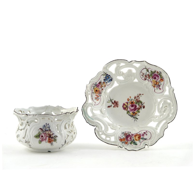 An unusual Chelsea reticulated bowl and stand c.1756, moulded with rococo panels painted with bright floral arrangements between pierced scrolling sections, the bowl's interior painted with a caterpillar and a leafy spray, red anchor mark to the bowl, a rim crack, 22cm. (2)
