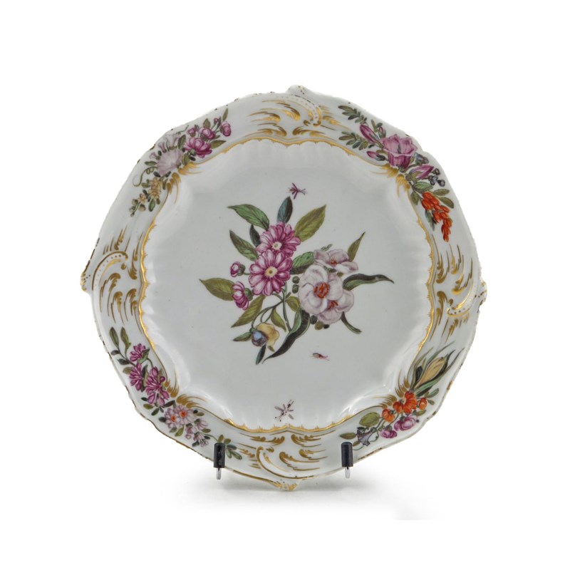 A good Chelsea plate c.1758, the well finely painted with flowers and small scattered flying insects, the rim moulded and painted with four further flower sprays issuing from moulded gilt scrolls, 21.7cm.