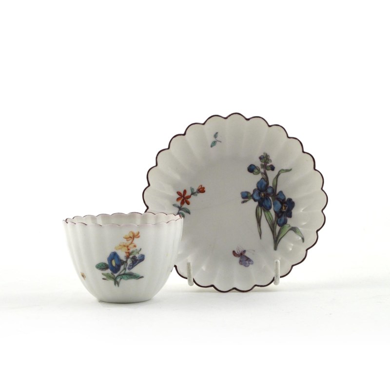 A Chelsea fluted teabowl and saucer c.1758-60, the saucer painted with a spray of blue flowers and a flying insect, the teabowl with scattered blooms and a beetle, brown line rim, the saucer cracked, 11.7cm. (2)