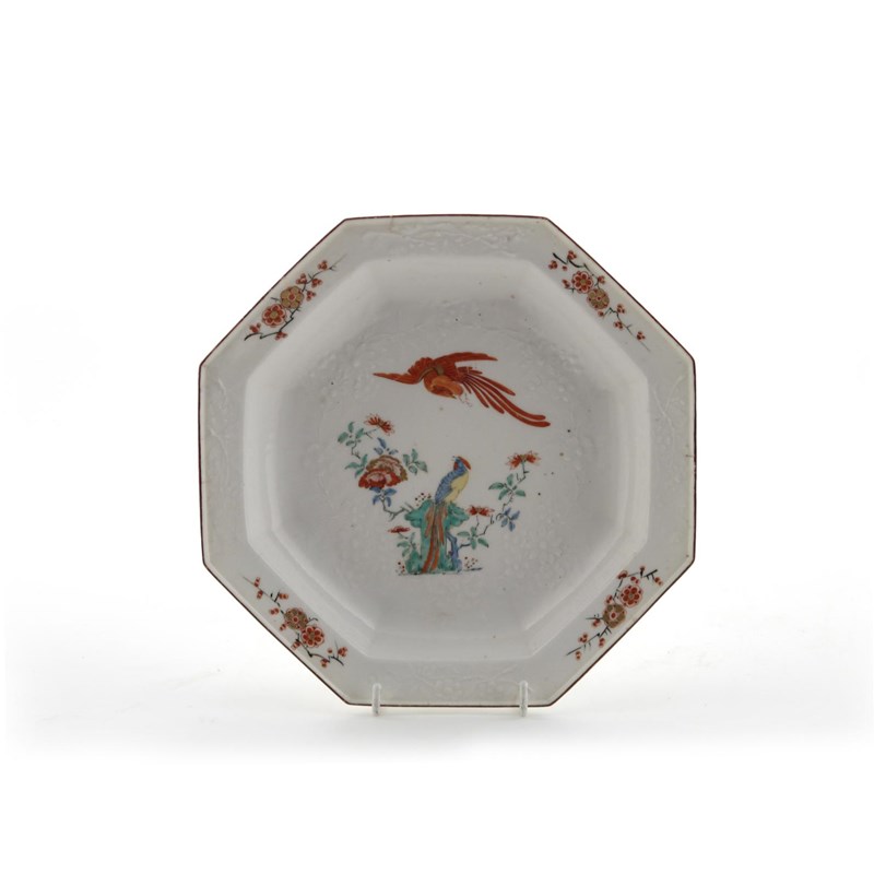 A Chelsea octagonal soup plate c.1752-54 moulded with flowering sprigs of blossom and painted in the Kakiemon palette with a phoenix in flight above a Ho-Ho bird perched on rockwork, brown line rim, red anchor mark, a 1cm hairline, 24.6cm.
