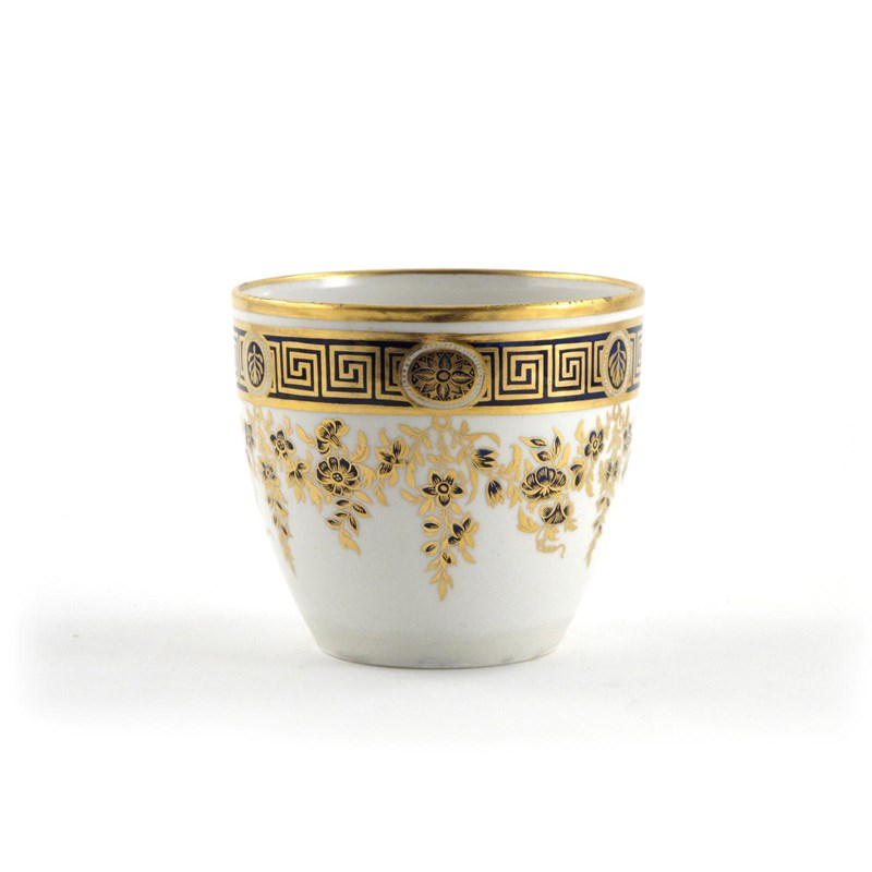 A rare Worcester câchepot c.1780, of unusual U-shaped form, decorated with blue and gilt flower garlands beneath a wide key fret band, open crescent mark to the base, 12.5cm.