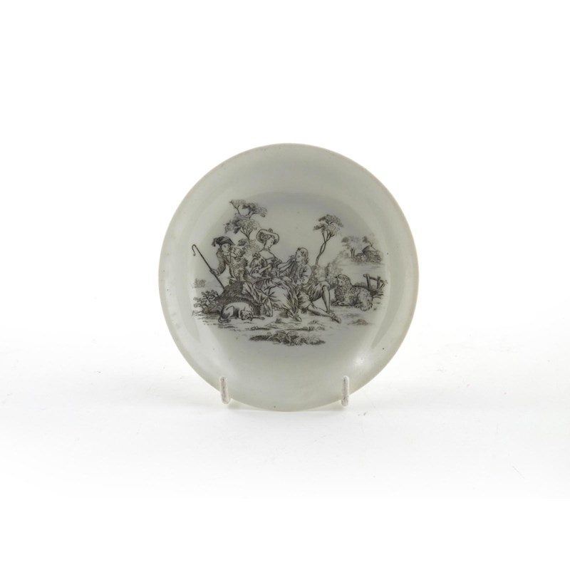 A Worcester printed saucer c.1755, decorated in black with the Peeping Tom print by Boitard and Hancock, two lovers being spied on by a boy with a shepherd's crook, a sheep and dog recumbent and blissfully unaware, 12.2cm.