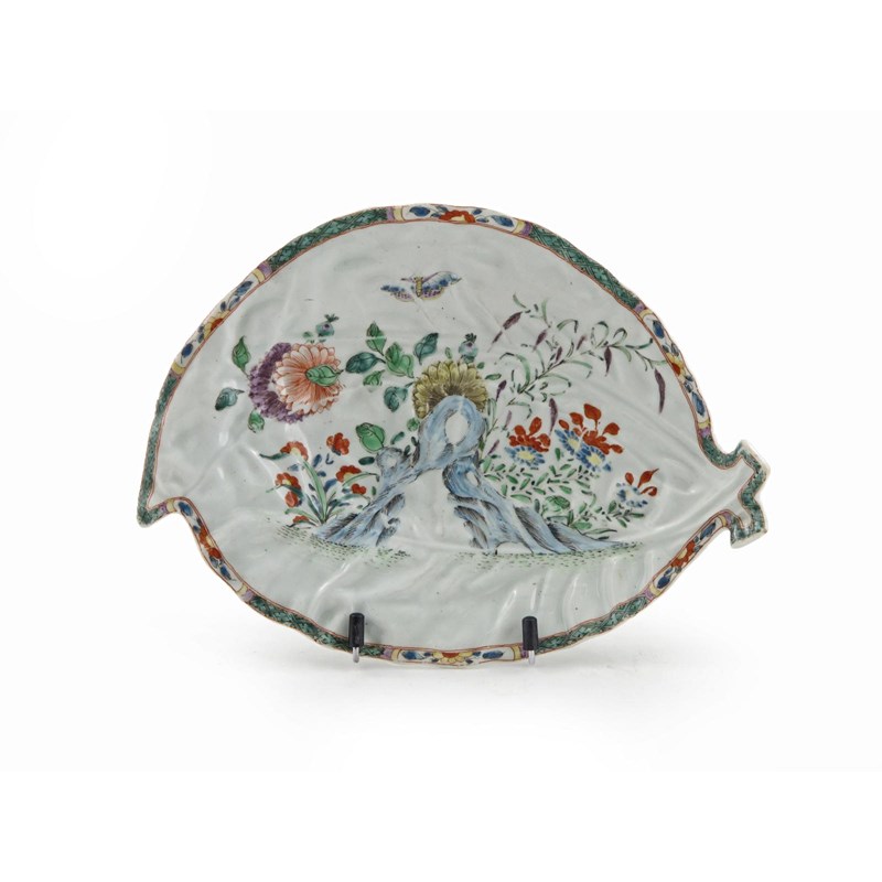 A Worcester double leaf dish c.1758, formed as two overlapping cos leaves decorated in the famille verte palette with bright Oriental flowers around holey rockwork, a large butterfly in flight above, the rim enamelled with floral panels alternating with bands of green hatching, a little wear, 26cm.