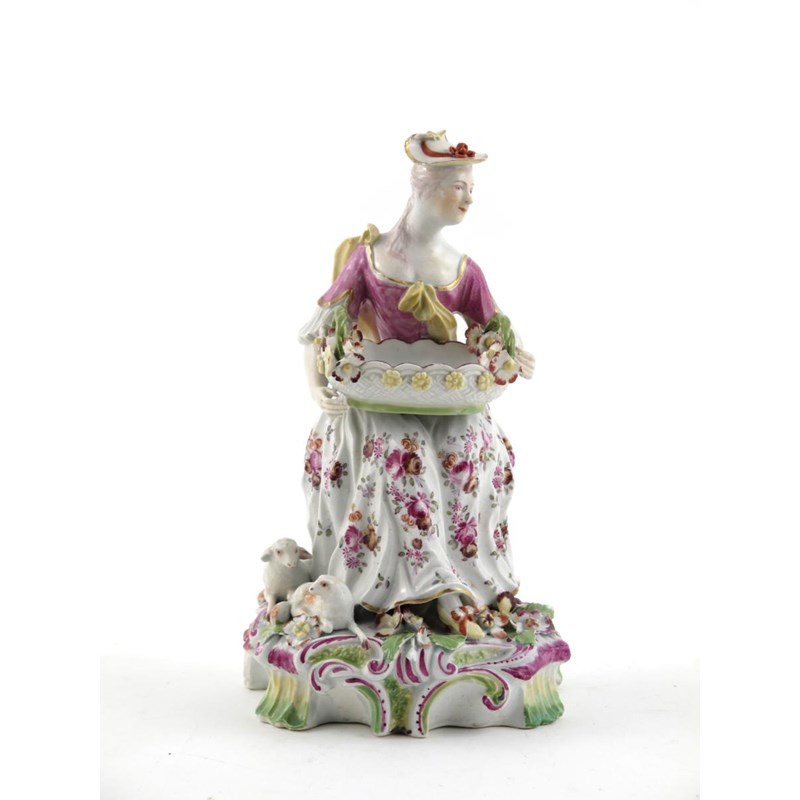 A large Derby sweetmeat figure c.1758, modelled as a shepherdess seated on a rocky stump with a two-handled basket in her lap, two sheep recumbent at her feet, raised on a scrolled base encrusted with flowers, small damages and restoration, 23cm.