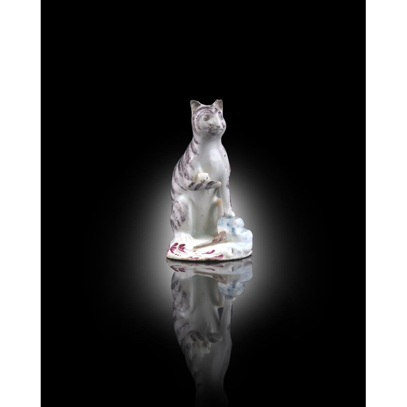 A rare Bow porcelain model of a cat c.1755-58, seated on its haunches with a mouse in one paw, the other paw resting on a blue mound into which a second mouse is scurrying, the cat's coat picked out with tabby markings in purplish grey, seated on a low scrolling base, 8cm.