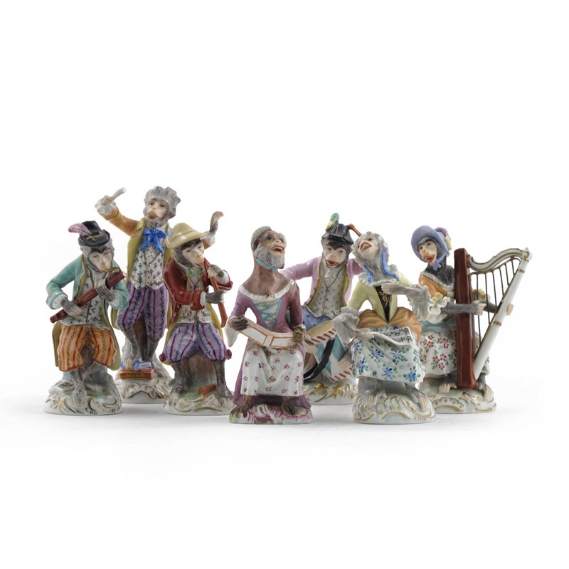 A Carl Thieme part monkey band late 19th century, after Meissen, and a French porcelain model of a monkey singer, modelled with various instruments including the harp, bassoon and drum, and with colourfully enamelled attire, blue printed marks, restoration to the French figure, 16cm max. (7)