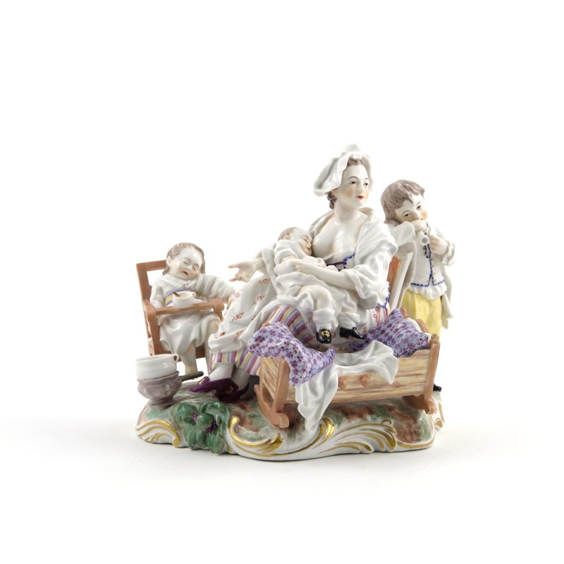 A Frankenthal group of The Good Mother c.1770, modelled by Karl Gottlieb Lück, the protagonist cradling a sleeping baby on her lap after suckling, a second child asleep in its high chair, while a third stands behind her, the empty crib with disturbed blankets standing beside her chair, blue crowned monogram mark to the base, a small amount of good restoration, 22cm across.