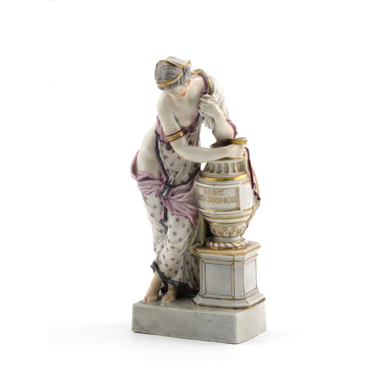 A Ludwigsburg figure of Artemesia mourning Mausolus c.1770-75, modelled by Beyer, draped in a tied robe and standing beside a gilded urn bearing a Greek inscription, with tears coursing down her cheeks and holding a goblet in her right hand, blue monogram mark, 16cm high.