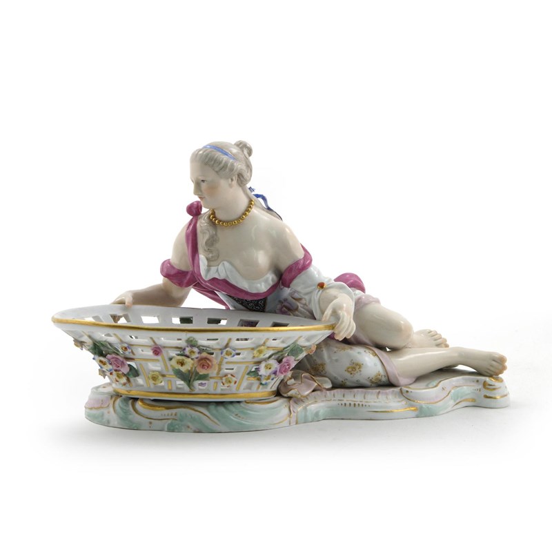 A large Meissen sweetmeat figure c.1900, modelled as a recumbent lady in Classical dress, holding the edges of a large reticulated basket painted and applied with flowers, cancelled blue crossed swords mark, 28cm across.