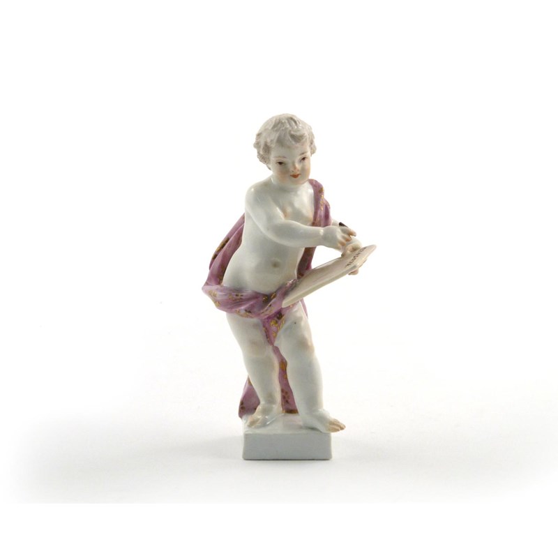 A Meissen figure of a putto from the Royal Court Pantry in Warsaw mid 18th century, emblematic of Arithmetic, standing on a small square base and draped in a pink robe gilded with leafy sprigs, holding a tablet bearing the numbers 1 to 8, blue crossed swords mark to the reverse, the base marked in puce 'KHCW' for the Hof-Conditorei Warschau, 12cm.