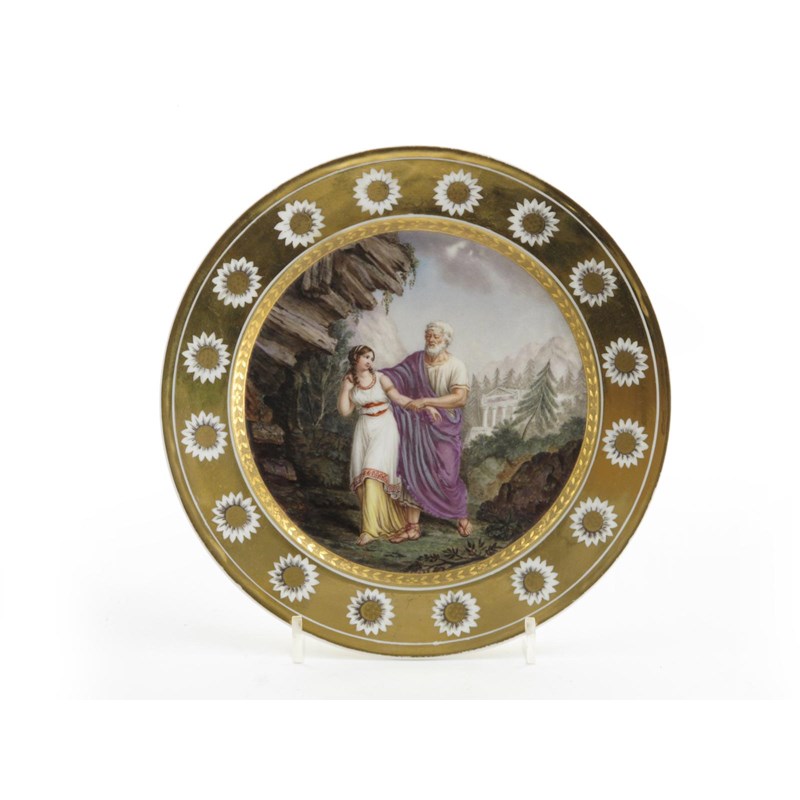A Paris (Fleury) porcelain mythological plate c.1820, painted with a young girl leading the blind Belisarius through a wooded landscape with Classical buildings behind, within a gilt border with flowerhead motifs, gilt mark to the reverse, 23cm.