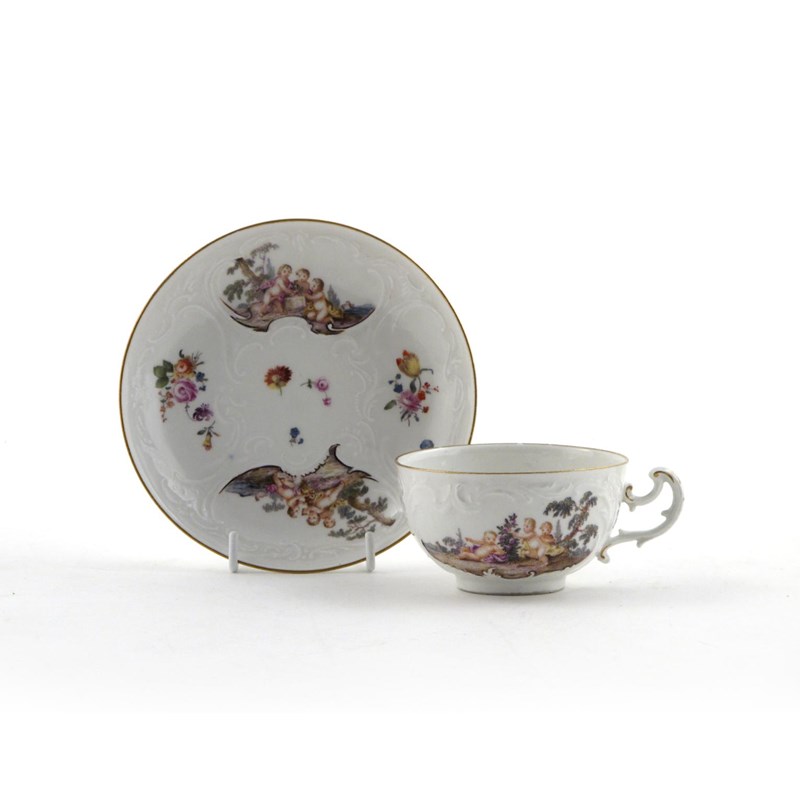 A good Meissen teacup and saucer c.1760, moulded with scrolling cartouches and finely painted with groups of putti and flower sprays, blue crossed swords marks, 13.5cm. (2)