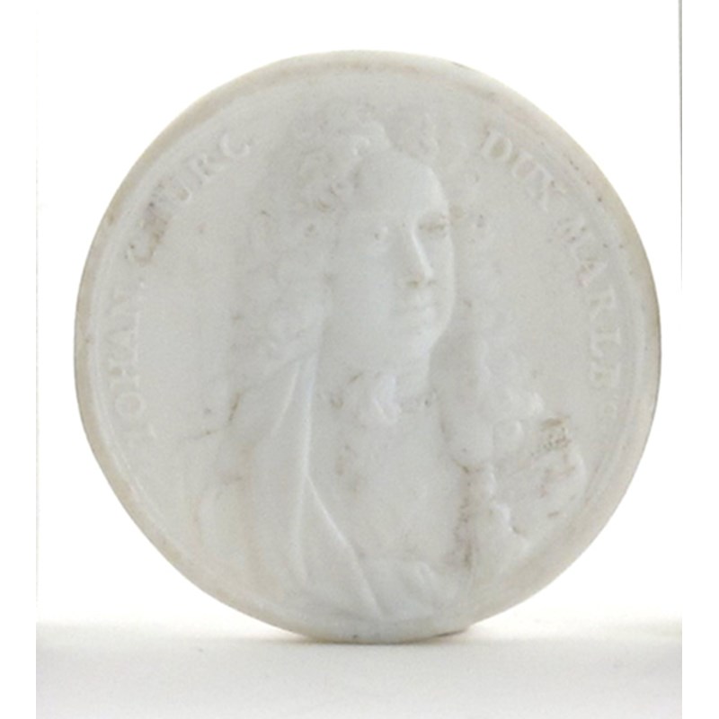 A glass tassie roundel of John Churchill, with a head and shoulders portrait, inscribed 'Iohan Church. Dux Marlb.', moulded with the initials JD, 4.2cm.