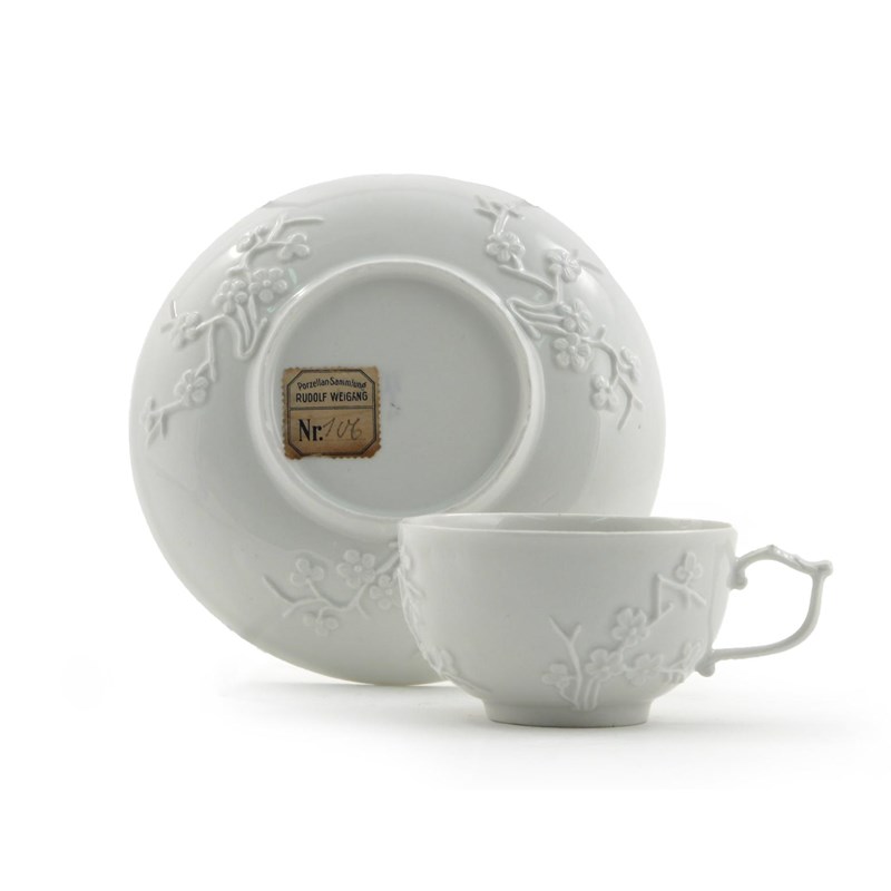 A Meissen white-glazed cup and saucer c.1740, each applied with three sprays of flowering prunus, faint blue crossed swords marks, 13.7cm. (2)
