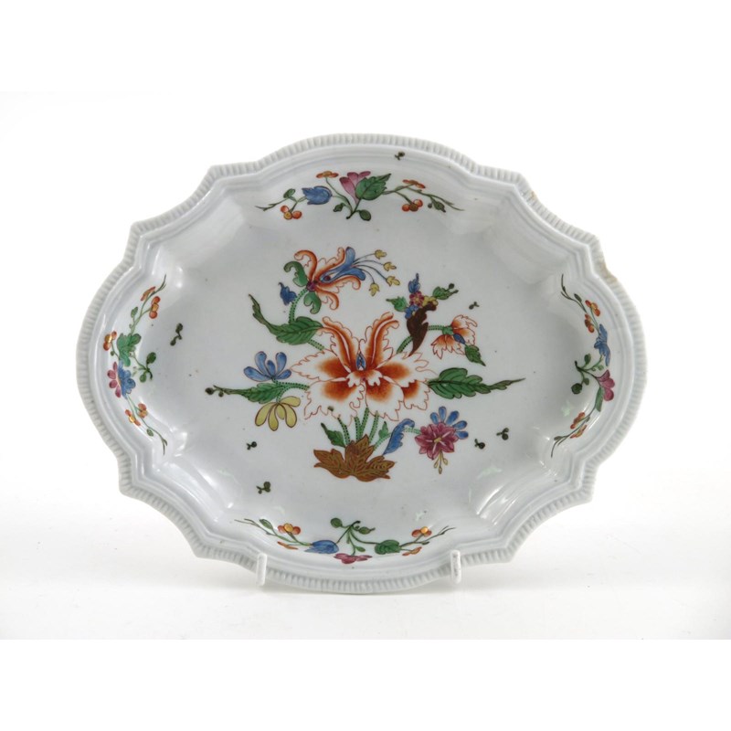 A Doccia oval dish c.1760, with silver-shaped rim, brightly painted in the Tulipano pattern, with a central design within four vignettes, 25.5cm.