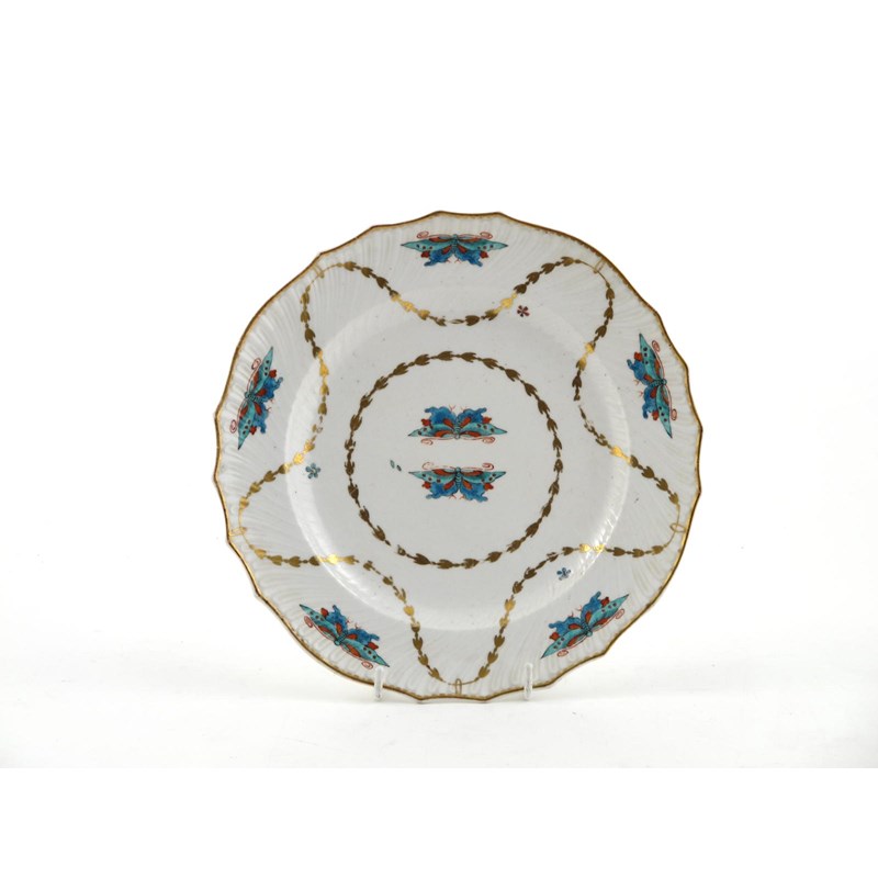 A Tournai plate c.1775-80, painted with seven butterflies in the Kakiemon palette, within gilt husk bands, the rim with fluted moulding, 23cm.