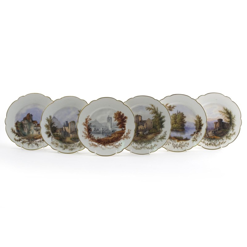 A set of six Paris porcelain plates c.1871, variously painted in detail with landscape scenes, of figures approaching a castle gate, of cattle drinking in a lake, and other chateau scenes, two signed 'H. Lemarchant 1871', four signed on the reverse 'L. Lemarchant 1871', 22.2cm. (6)