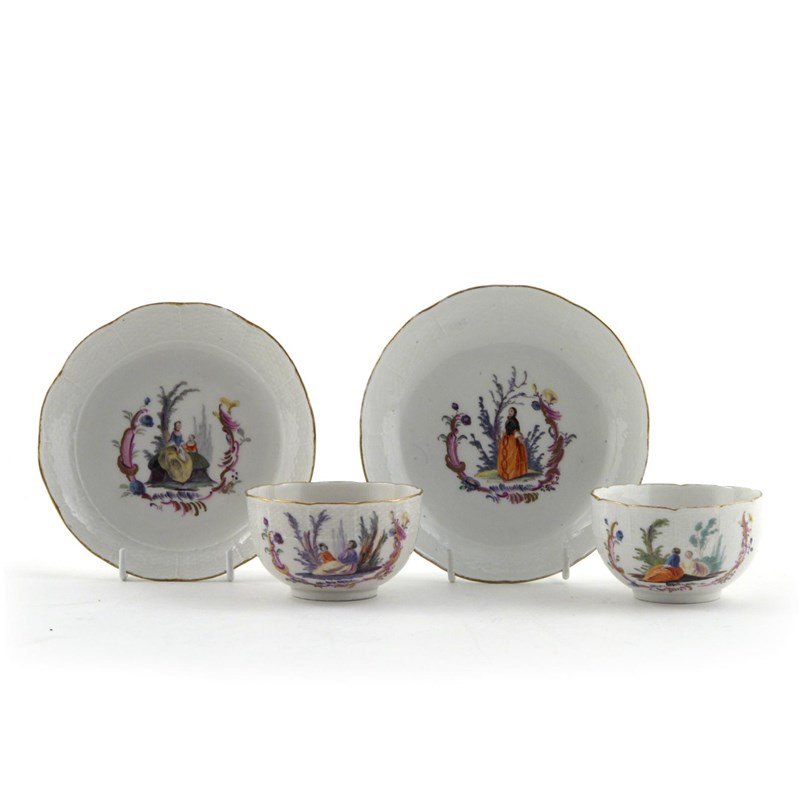A pair of Meissen teacups and saucers 18th century, painted with scenes of maidens in rococo landscapes within osier moulded borders, blue crossed swords marks, a small chip to one saucer, 13.7cm. (4)