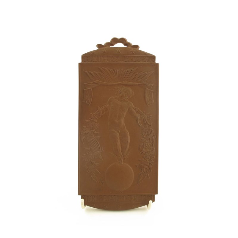 A Meissen 'Böttger Steinzeug' year plaque c.1921, by Paul Borner, modelled with a putto standing on a sphere, titled 'Die Staatliche Porzellanmanufaktur Ihren Freunden 1. Jan. 1921', the reverse with an impressed crossed swords and numbered 70 of 100, 21cm.