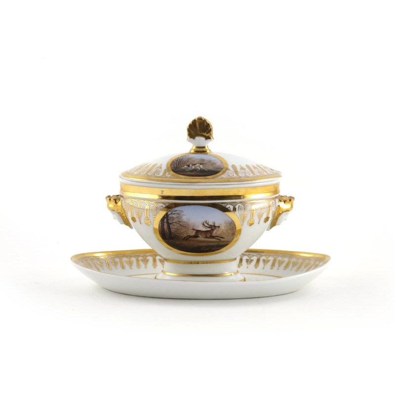 A Paris porcelain sauce tureen and cover 19th century, with integral stand, painted with panels of a stag running, and a dog chasing a bird in flight, the cover with panels containing two hares and a dog, within bold gilt borders, 26cm. (2)