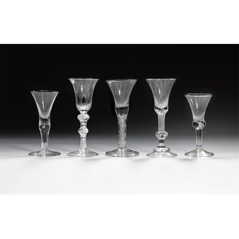 Five various wines, all with bell-shaped bowls, one raised on a composite stem of airtwist above a double tear knop, two on folded feet, one on a double-knopped multiple series opaque twist stem, mid 18th century, 17.5cm max. (5)