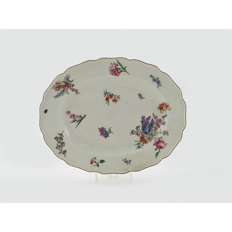 A Chelsea shaped oval dish, finely painted with loose flower sprays and individual blooms, a ladybird crawling off the edge, red anchor mark, brown line rim, c.1755, a little restoration to the rim, 31.8cm.