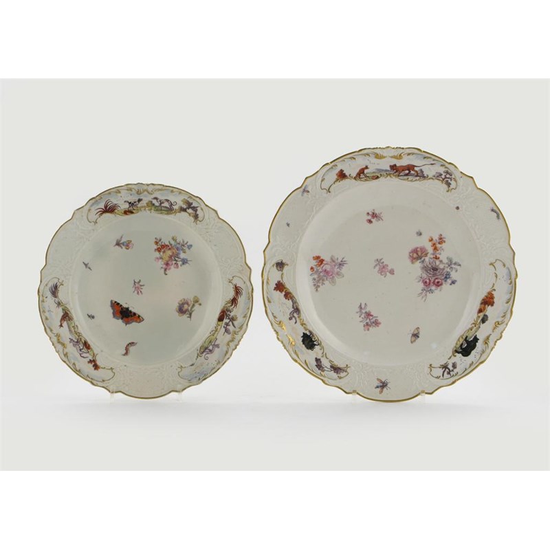 Two Chelsea plates of Warren Hastings type, the moulded rims painted with vignettes of fable groups of animals in the manner of Jefferyes Hamett O'Neale, the wells with scattered flowers, butterflies and insects, red anchor marks, c.1755, damages and restoration, 28.8cm max. (2)