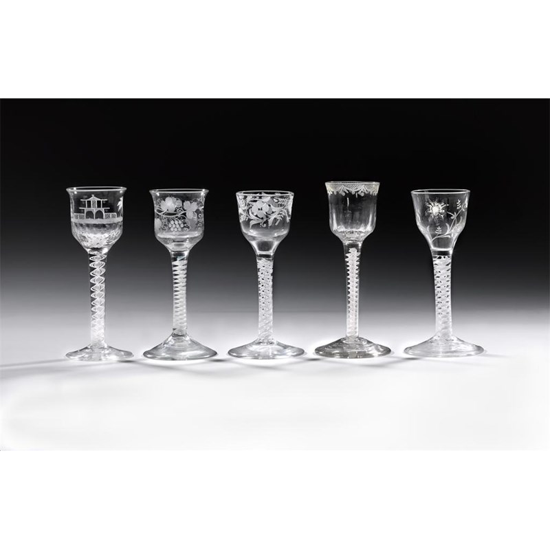 Five engraved wine glasses, variously decorated with a large sunflower, a chinoiserie pagoda, a grapevine and foliage, two with wrythen bowls, all raised on single or multiple series opaque twist stems, mid 18th century, one footrim reduced, 15.5cm max. (5)