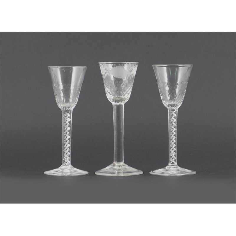A pair of wine glasses, with hammered bowls raised on mercury-twist stems, and a wine glass with hammered bowl, engraved with a pineapple border and raised on a plain stem, 2nd half 18th century, 17.2cm max. (3)