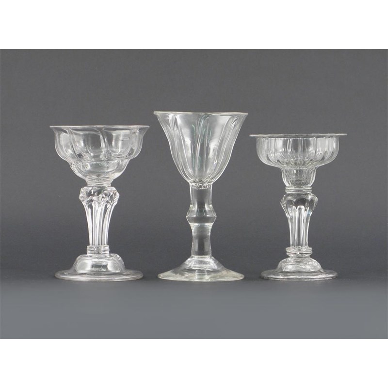 Three sweetmeat glasses, with moulded bowls, two raised on octagonal faceted stems and domed folded feet, the third on a knopped stem and plain foot, 18th century, 17.5cm max. (3)