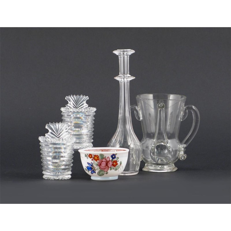 A pair of cut glass piggins, with ribbed bodies, an opaline glass teabowl painted with flowers, a glass posset pot and a toddy lifter, 18th and 19th centuries, 17cm max. (5)
