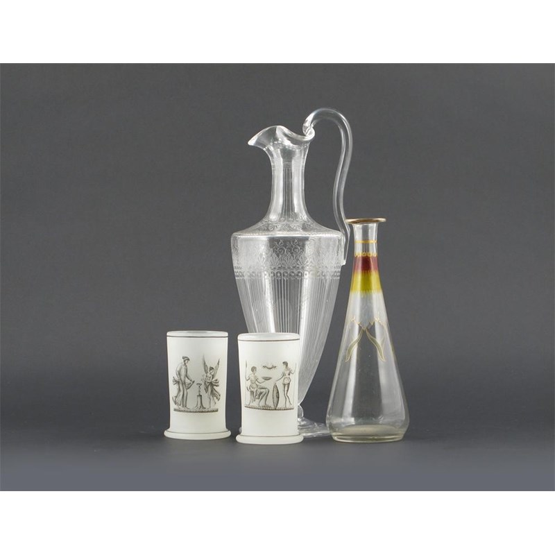 A pair of Richardson opaque glass spill vases, decorated in black with Classical and mythical figures at various pursuits, a claret jug, finely engraved with a linear design, and a tapering glass flask, painted with three bands of colour to simulate petals, late 19th / early 20th century, 32cm max. (4)