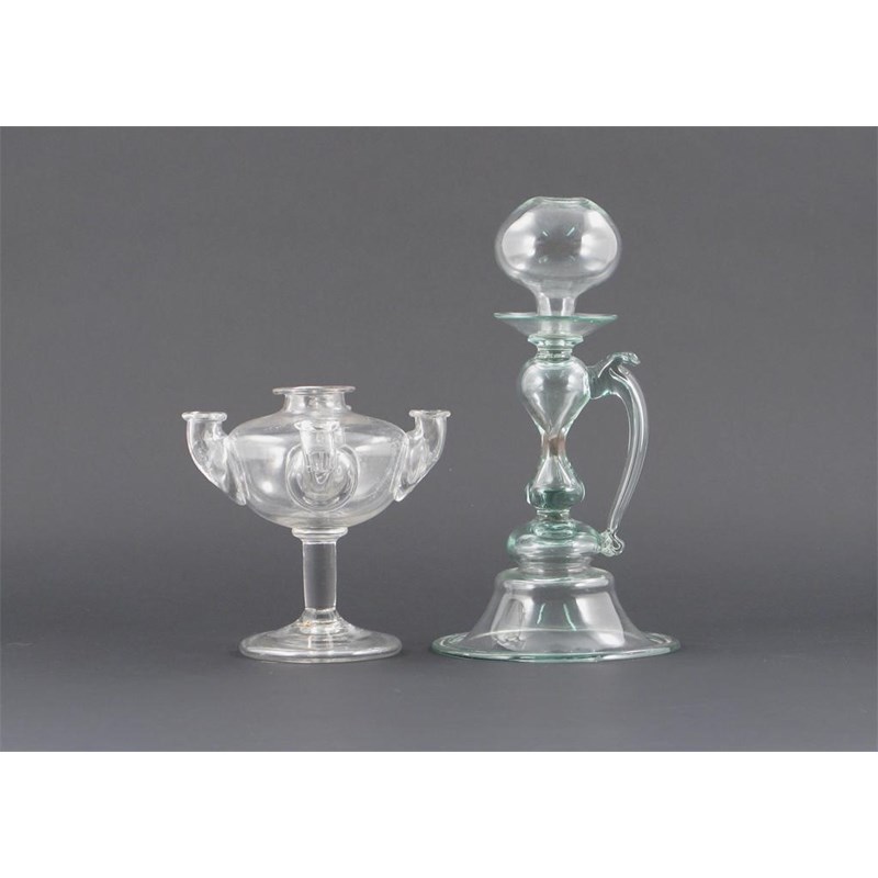 Two glass open flame lacemaker's lamps, one with a globular bowl raised on a waisted stem and tall domed foot, a handle to one side, the other with a rounded body issuing four flame points from the sides around a central opening, 18th / 19th century, 27cm max. (2)