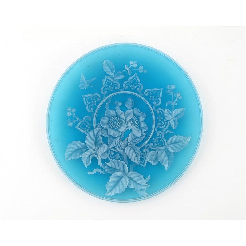 A Stourbridge cameo glass plate, attributed to Thomas Webb, overlaid with a small butterfly fluttering above wild rose, rambling over and around a Gothic-type panel, 2nd half 19th century, a faint star crack, 20.7cm.