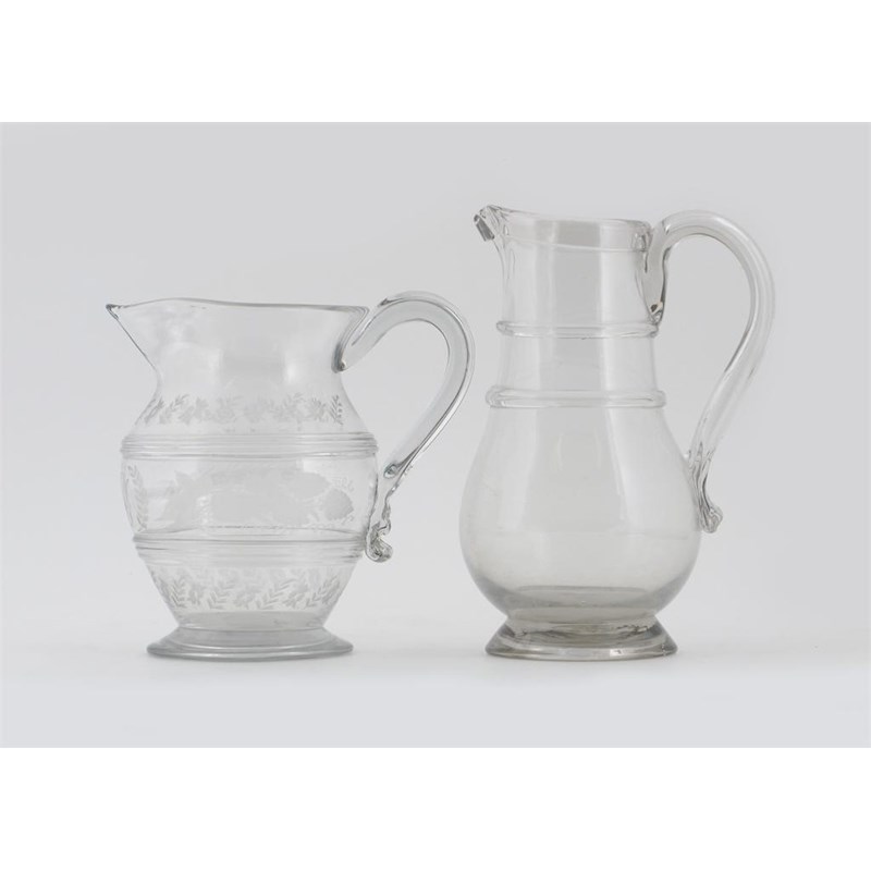Two glass jugs, one engraved with hops and barley either side of monogrammed initials, the other with two neck rings beneath a wide folded rim, both on circular pedestal feet, 19th century, 23cm max. (2)