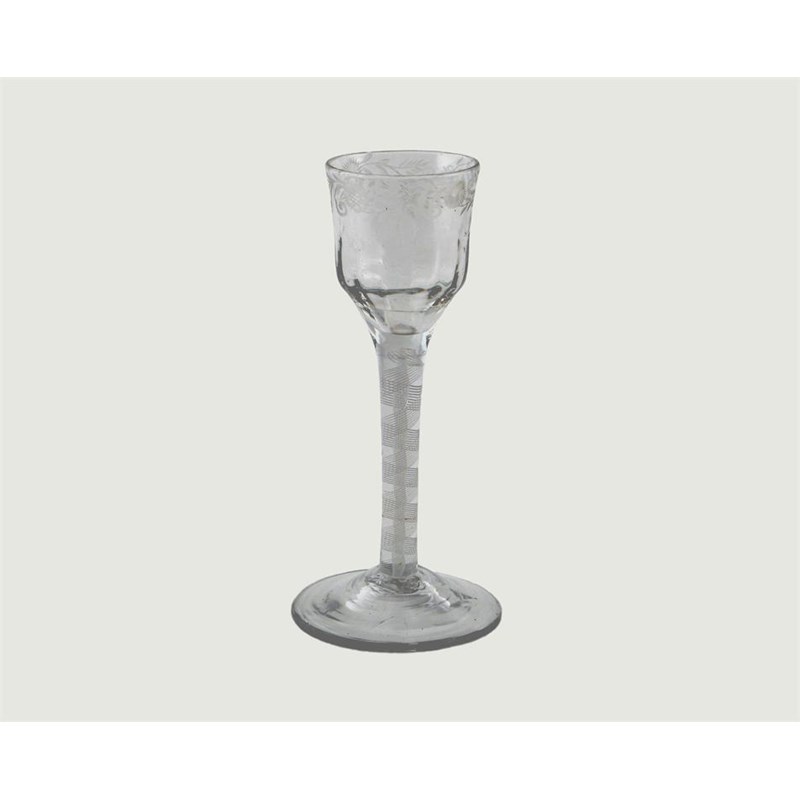 A wine glass, the moulded bowl engraved with a scrolling foliate design, raised on a double series opaque twist stem, mid 18th century, minor faults, 14.8cm.