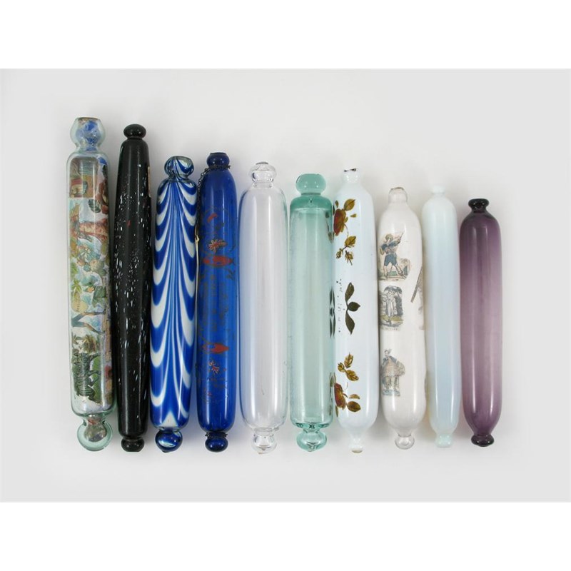 Ten glass rolling pins, variously decorated with enamel, decalcomania and different coloured glass, 19th / 20th century, some damages, 44cm max. (10)