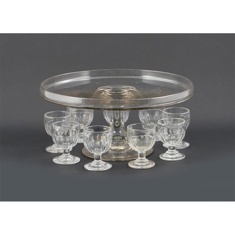 A large glass tazza or syllabub stand with a set of nine glasses, the tazza modelled with a tall lipped edge, the glasses raised on a short stem with faceted bowls, 19th century, 35cm max. (10)