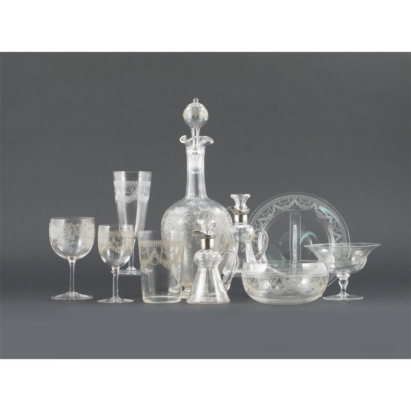 An extensive collection of glass, delicately etched with floral swags and garlands, early 20th century. Comprising: two claret jugs and five stoppers, six bowls, three footed dishes, seven plates, four tumblers and eighteen glasses in three sizes. (45)